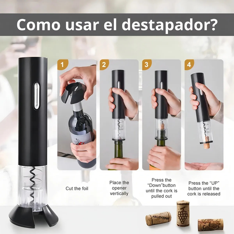 Con solo colocarlo sobre la botella y presionar un botón, el corcho sale automáticamente. Ideal para cenas, reuniones o momentos especiales.